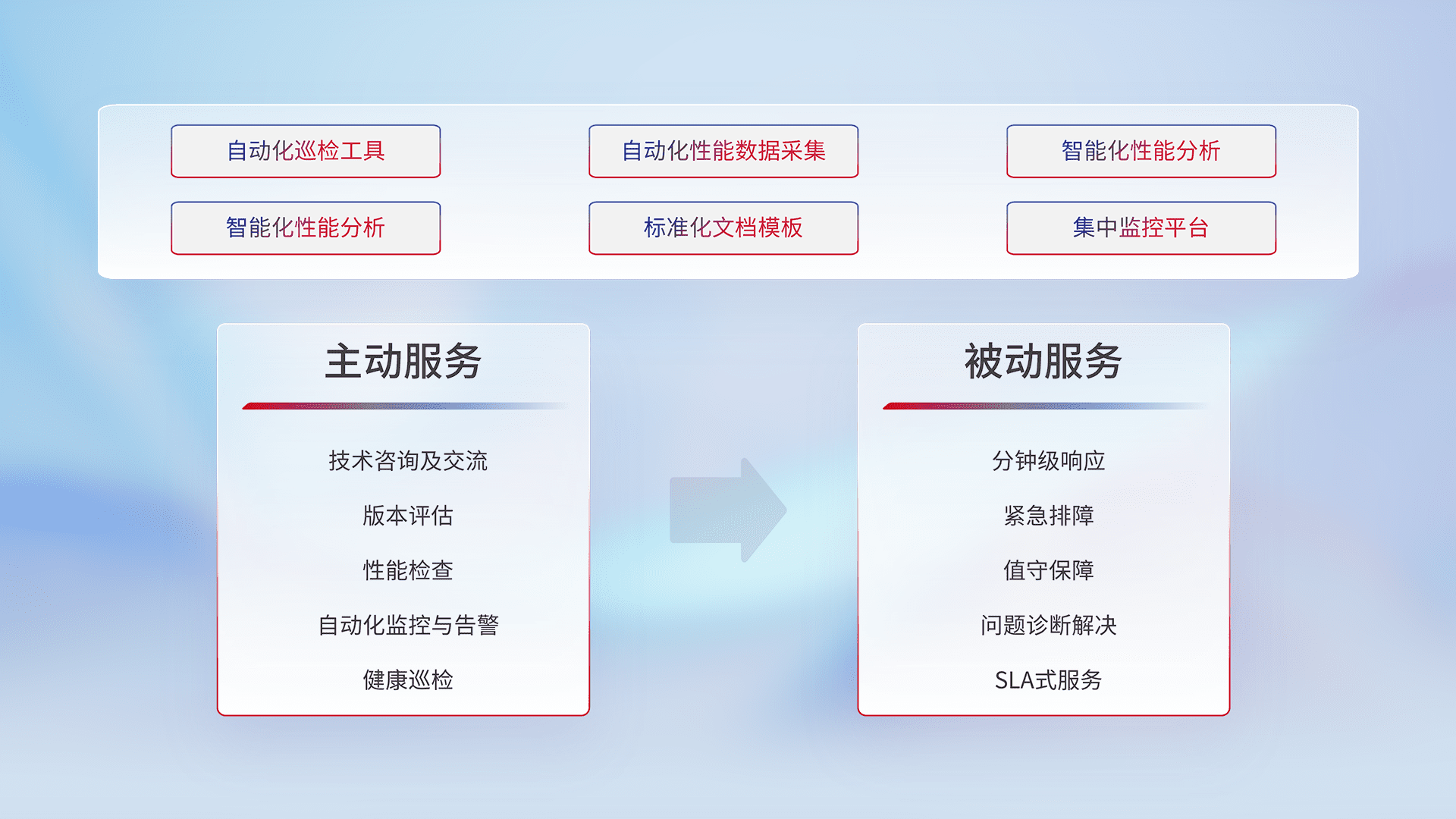 智能化工具和标准化文档,,保障服务质量,,,提供主动服务(包含技术咨询、、、、版本评估、、性能检查、、、自动化监控与告警、、健康巡检)和被动服务包含(分钟级响应、、、紧急排障、、、、值守保障、、、问题诊断解决、、、SLA服务)。。